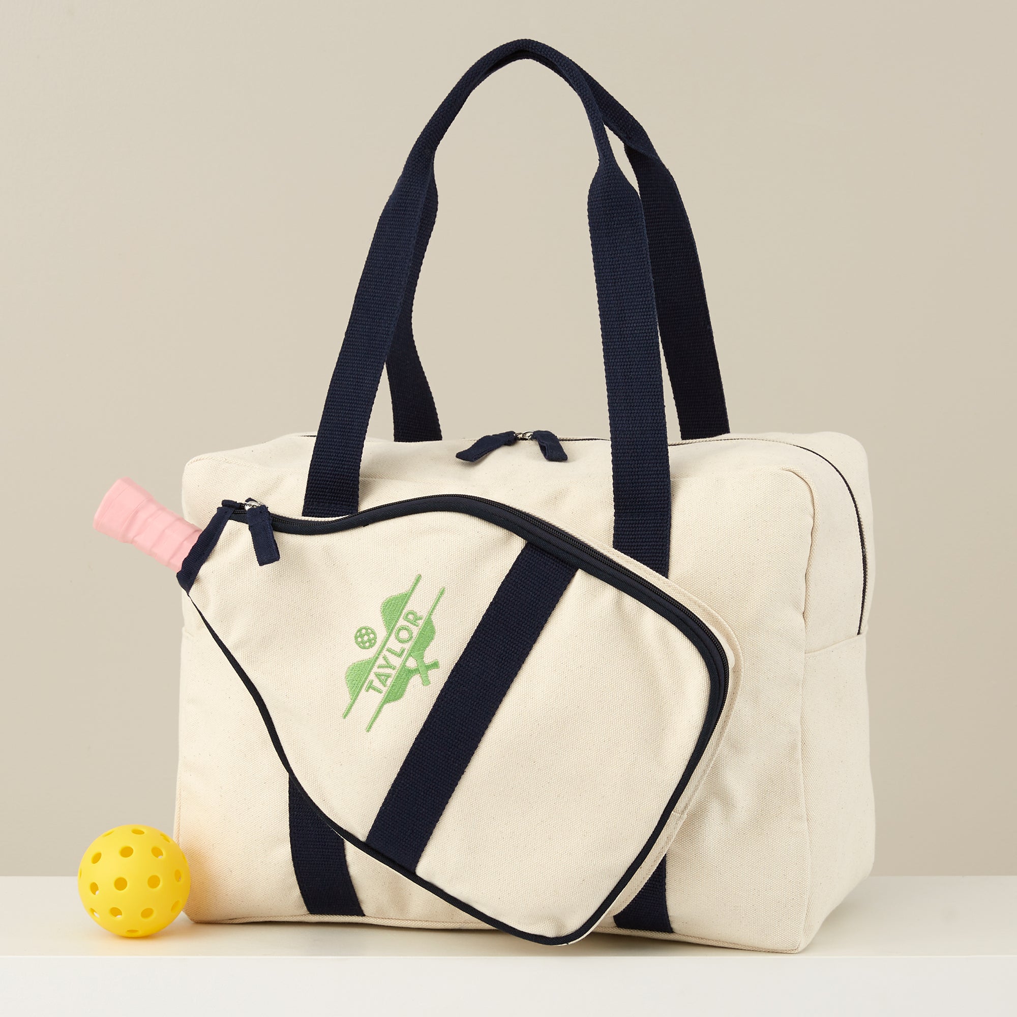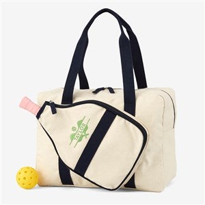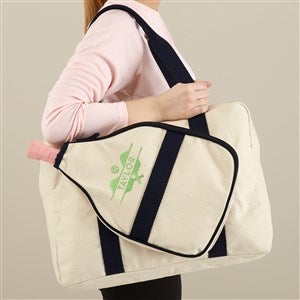 Hit the courts in functional style this season with our Embroidered Pickleball Duffle Bag. Pickleball Bag is made out of canvas and has a paddle shaped pocket for easy access to your gear.