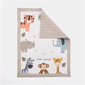 Our Embroidered Safari Animals Quilted Blanket will keep them cozy and warm! They will love the whimsical safari animals on the front of the quilt. Embroider the bottom of the quilt with their name, birthdate, or a short message.