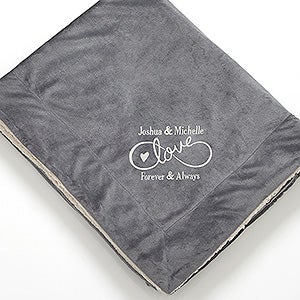 Our luxurious blanket is skillfully embroidered with any name or names and any 1 line message below the infinity symbol. Choose from multiple thread colors for a one of a kind blanket they will love to snuggle up with.