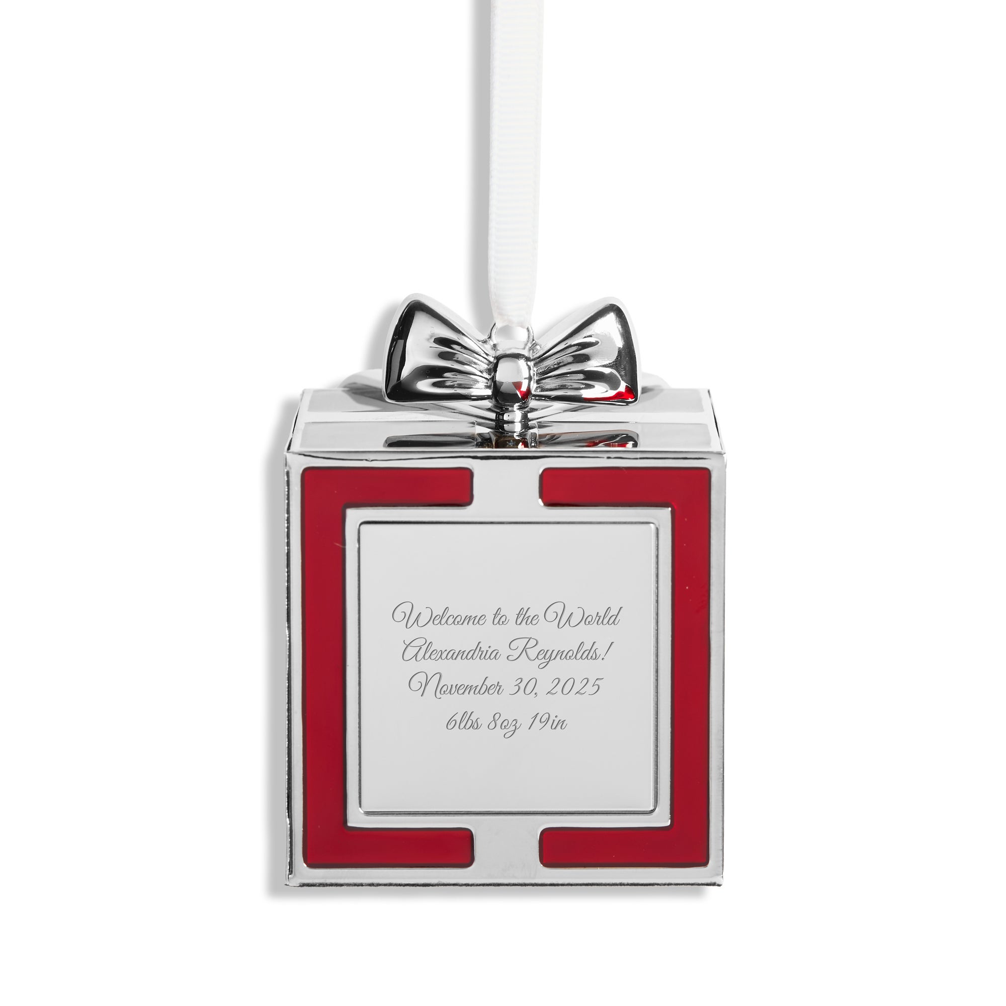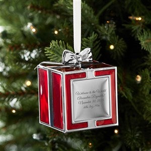 Wrap up the magic of the season with this Present with Bow Ornament, available in your choice of festive red or classic green. Designed with a gleaming silver-tone finish and topped with a polished bow, this ornament is a timeless way to celebrate life’s most special holiday moments. The front features a sleek silver plate that can be engraved with your own heartfelt message, name, or date — turning a simple ornament into a cherished keepsake.