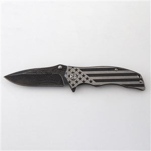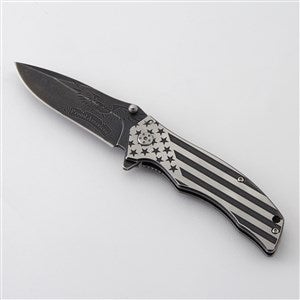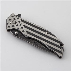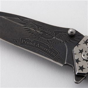 The Engraved American Flag Pocket Knife is quality crafted of steel in a sleek antiqued finish. The debossed flag design and steel construction will provide years of reliability and use, creating a unique gift for holidays, birthdays, groomsmen, and more.