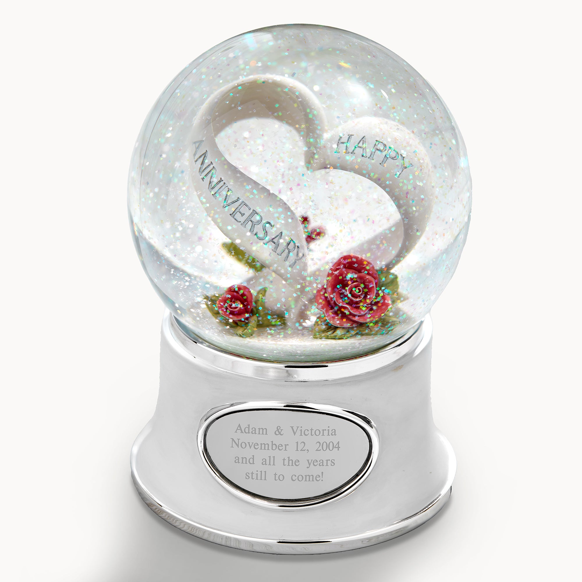 - Sculpted heart water globe that says "Happy Anniversary"