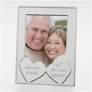 Capture your favorite moment for a lifetime in the Engraved Anniversary Message Double Hearts Silver Picture Frame. Makes an elegant gift for the happy couple to display their favorite photo!