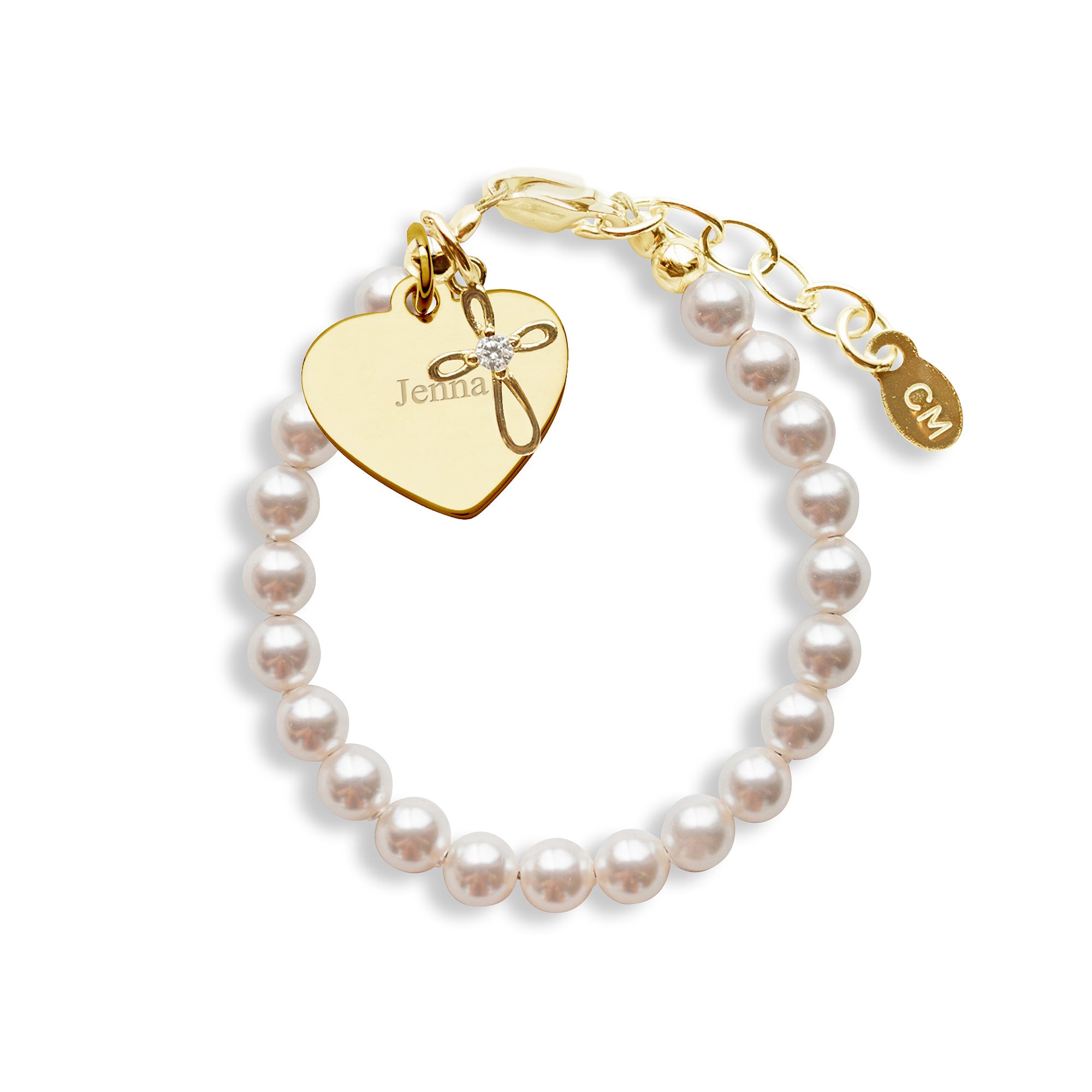Made with 14k gold plating (over sterling silver) and soft white high-end Austrian simulated pearls with a beautiful dainty cross charm with sparkling CZ! This high-quality bracelet is made with all precious metals and makes a very special gift for baptism, christening, dedication, or other religious gift. A gorgeous classic she will cherish forever! Bracelet comes in a beautiful gift box ready for gifting.