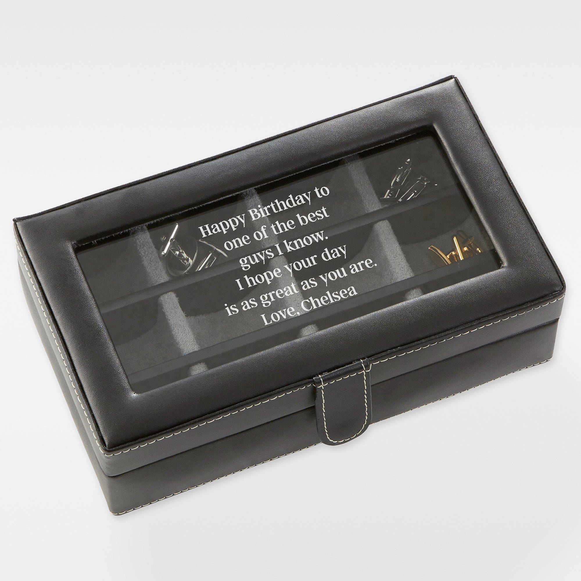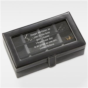 Our Engraved Birthday Message Leather 12 Slot Accessory Box is the perfect way to store and protect his valuable cuff links. Featuring 12 storage compartments, this box makes a special gift for him to to store his accessories.