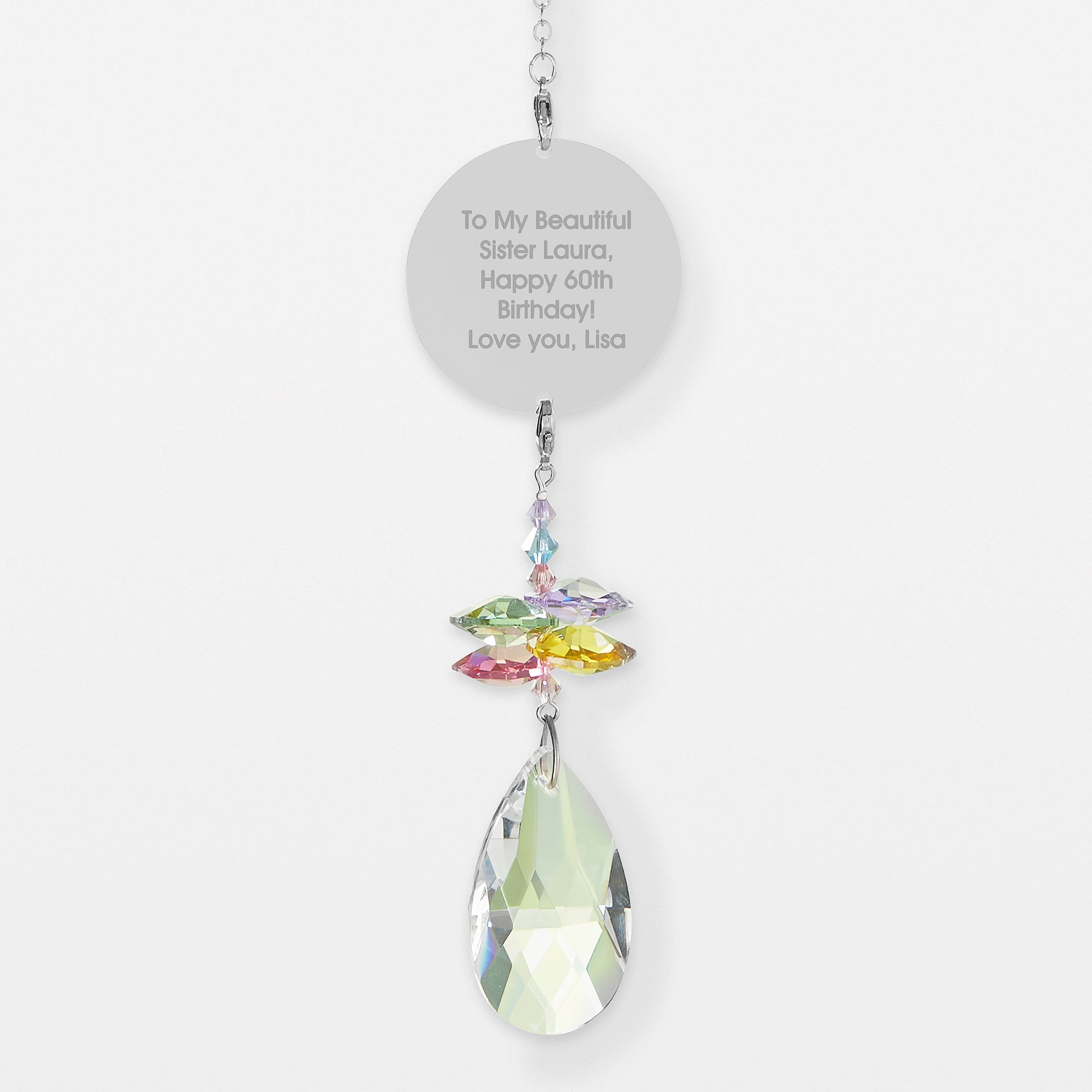 The wonderfully unique Engraved Birthday Message Rainbow Suncatcher expresses your sentiment and adds a personal touch to a bright window.