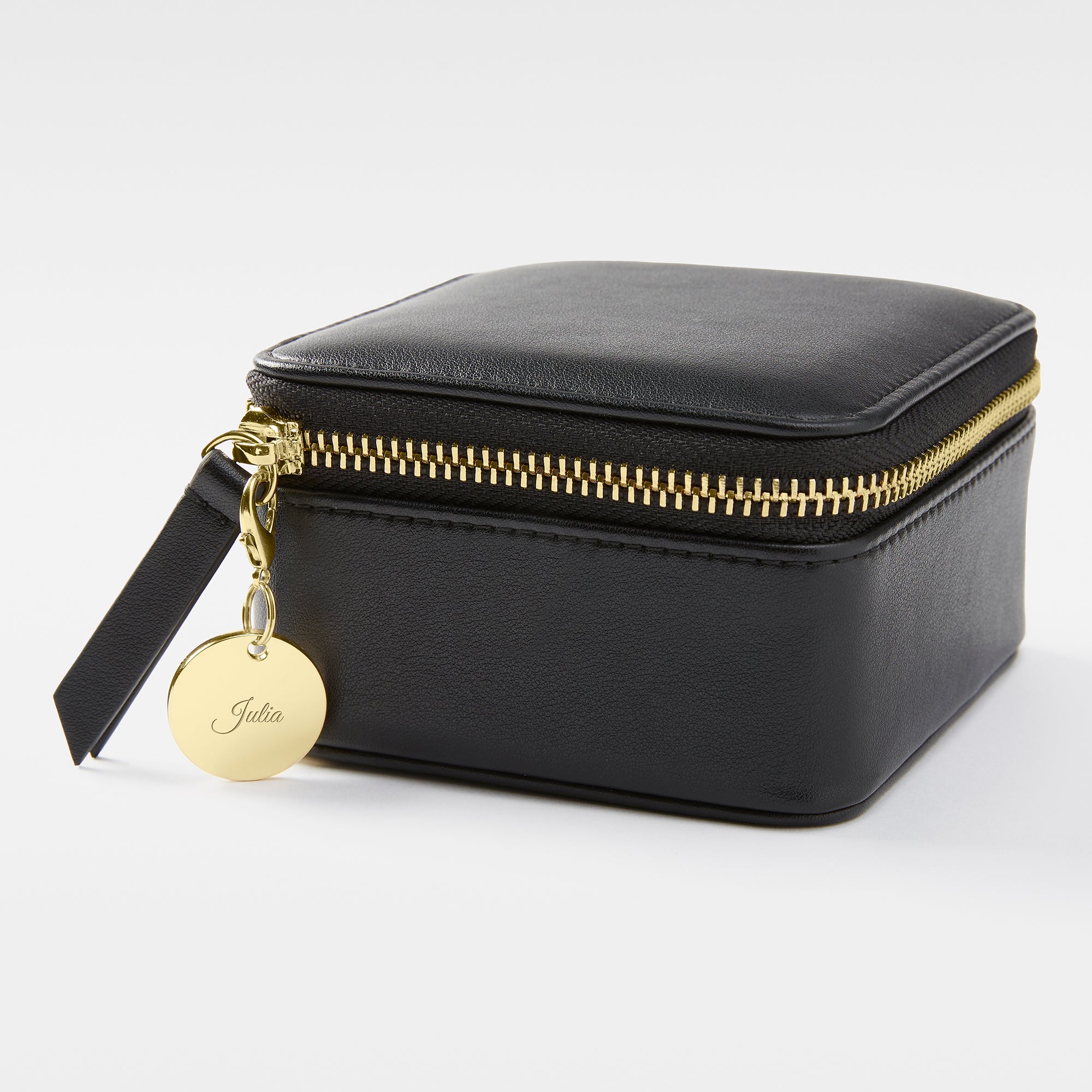 • Black leather travel jewelry case with gold zipper closure and hardware