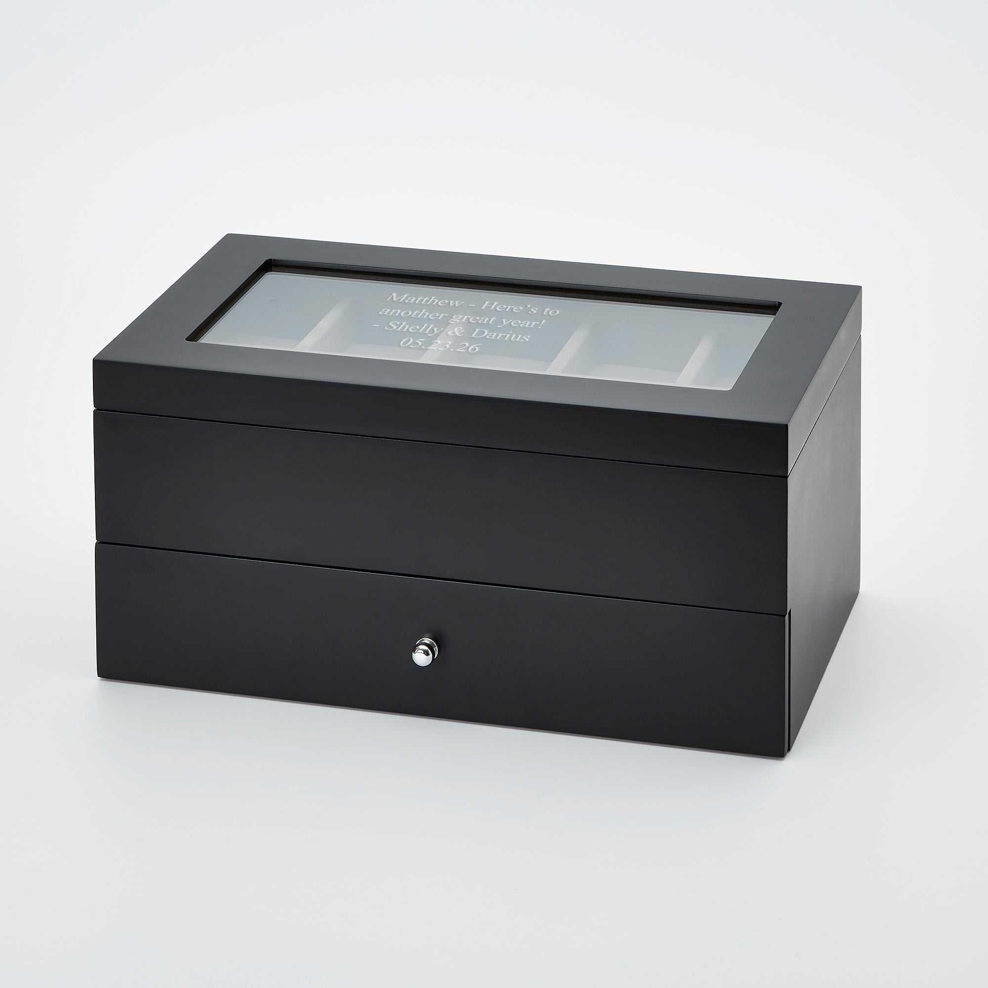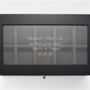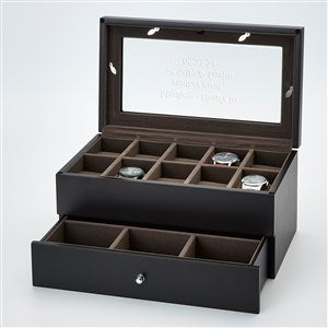 Exclusively designed by Things Remembered, this Black Wooden Watch Box with a Drawer will help them keep up to ten watches in pristine condition and also display them to be enjoyed at a moment's notice. The drawer can hold spare watch bands or other accessories. Engrave the glass lid with their name or a personal message. They'll love the sleek and clean design of this piece sitting on their dresser or shelf.