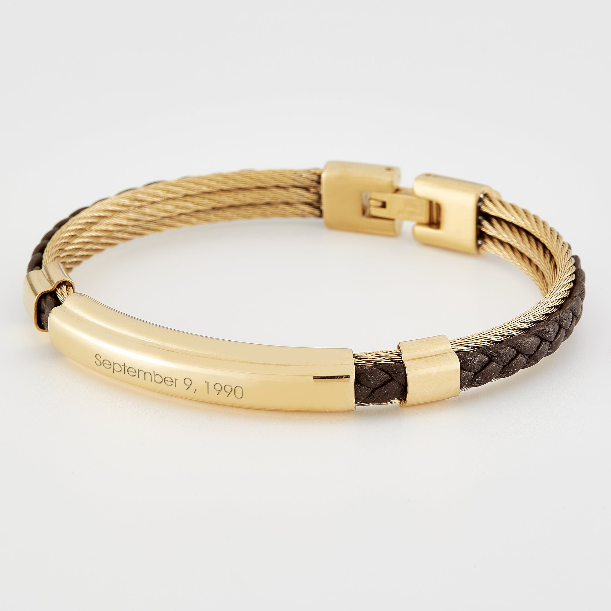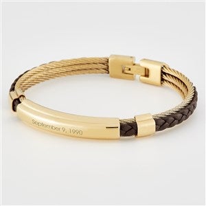This Genuine Brown Leather and Golden Corded ID Bracelet will add a special touch each time it is worn! They will love the corded leather band detail and your personalized engraving on the front of the bracelet. Gift for birthdays, graduation, anniversaries, holidays, and more! We also offer this bracelet in a black leather and stainless steel version.