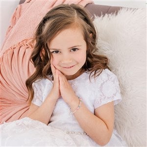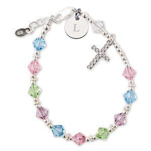 Our Engraved Children's Sterling Silver Beaded Rosary Bracelet is the perfect gift for to celebrate their religious ceremony. This is a timeless keepsake rosary bracelet designed and hand-beaded in the USA.  This is made using only the finest materials such as 100% sterling silver components, pastel high-end Austrian crystals, sparkling silver accents, and adorned with an intricate sterling silver cross charm.  This includes an engraved initial coin charm (10mm) making it extra special just for her! This is an heirloom she will cherish forever.