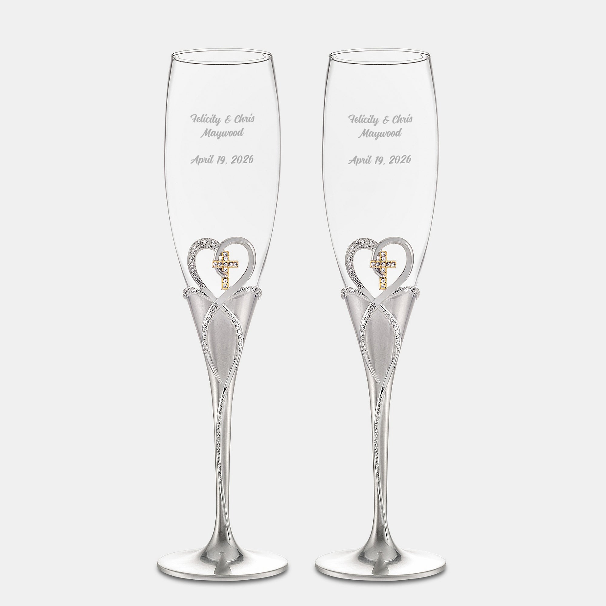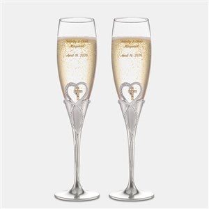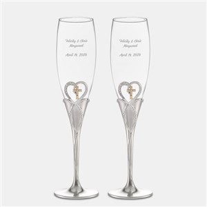 - Champagne flute set with gold-toned cross and silver-toned heart details