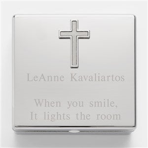 Our Cross Detail Jewelry Box stores their favorite treasures in an elegant style that reminds them of their faith. This square box with hinged lid can easily hold their go-to jewelry and accessories when they're not being worn. They'll love it on its own or paired with a piece of jewelry as a gift. This box makes an even more personal addition to an heirloom hand-me-down!