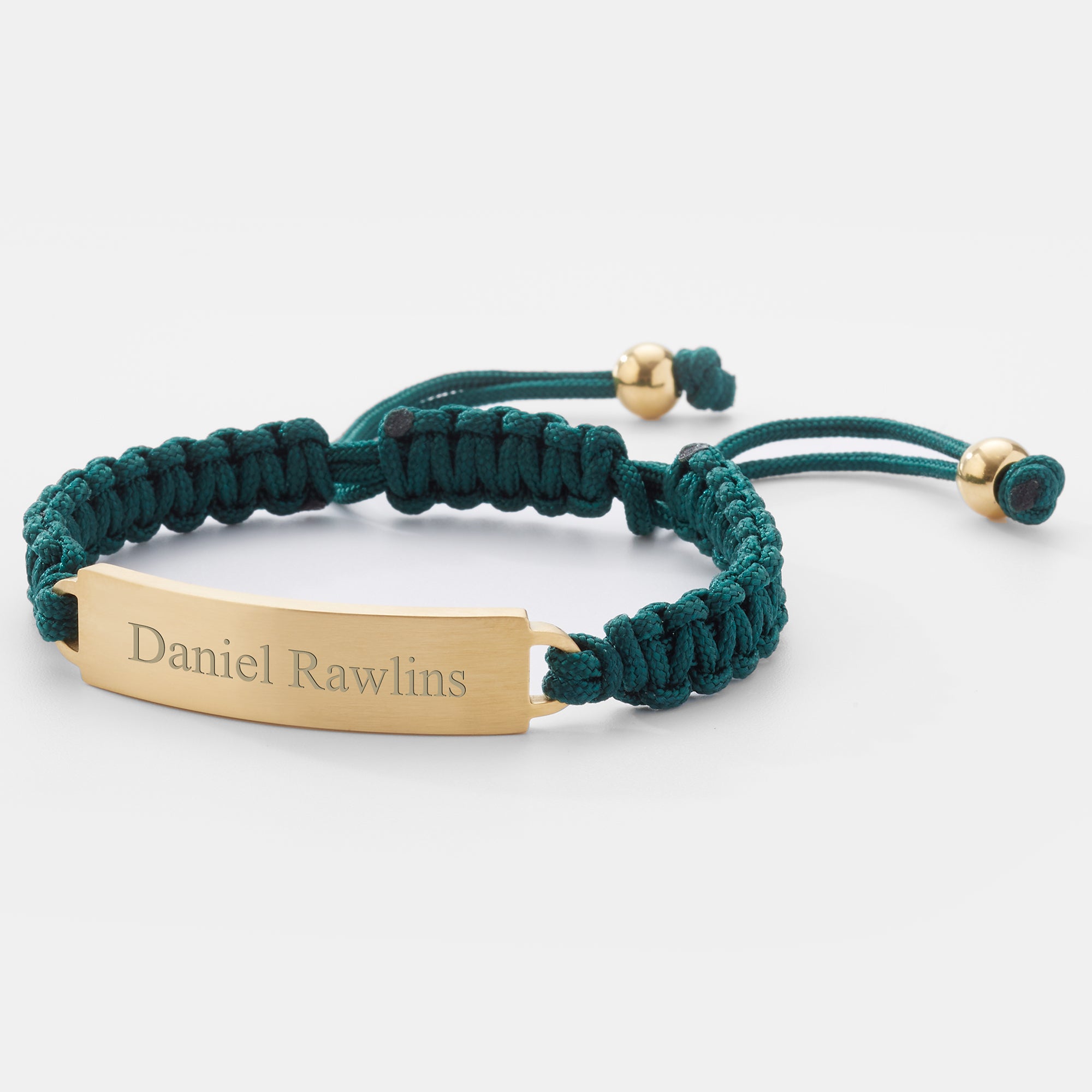 - Dark green corded ID Bracelet with gold ID pendant and sliding closure