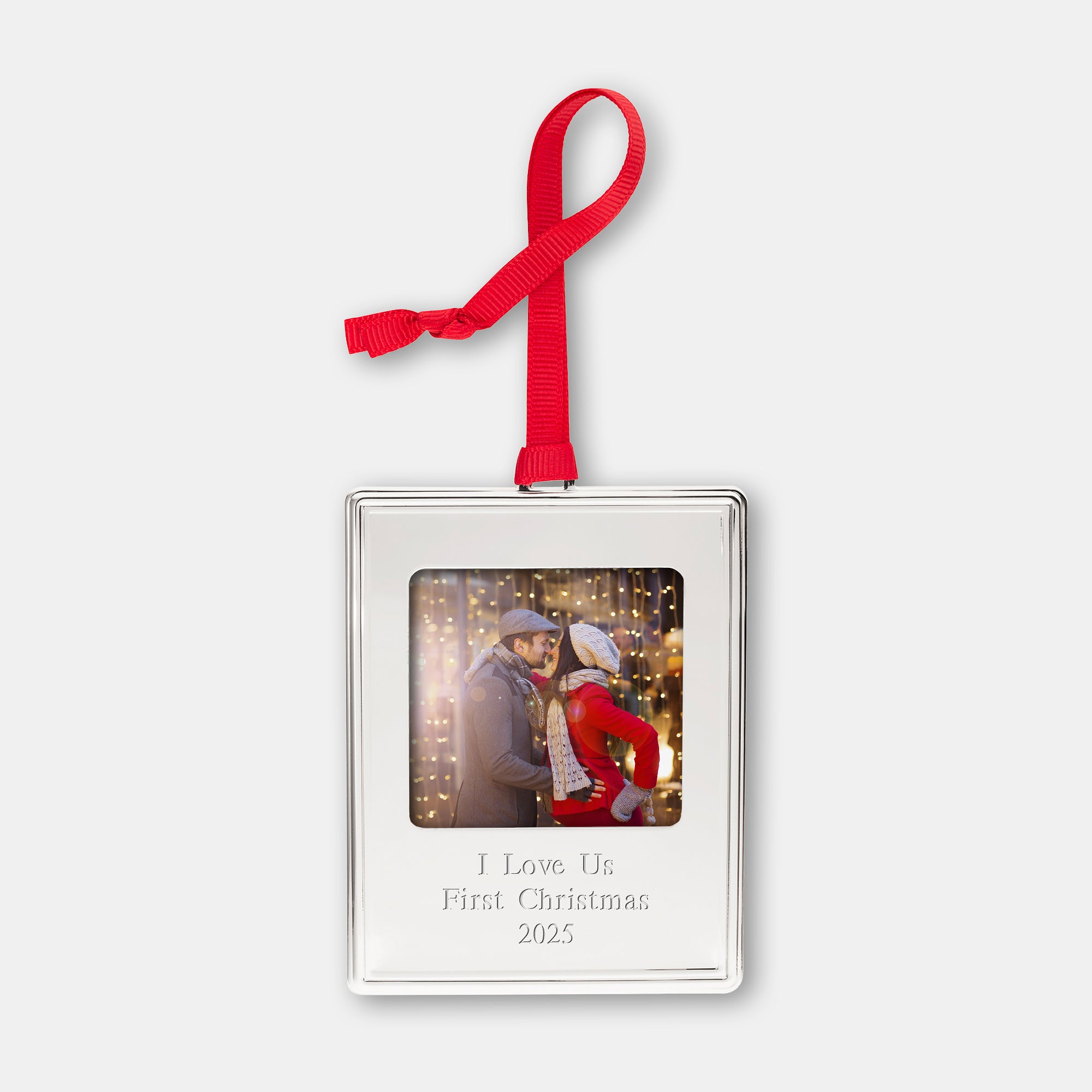- Silver Photo Frame Ornament with red grosgrain hanging loop.