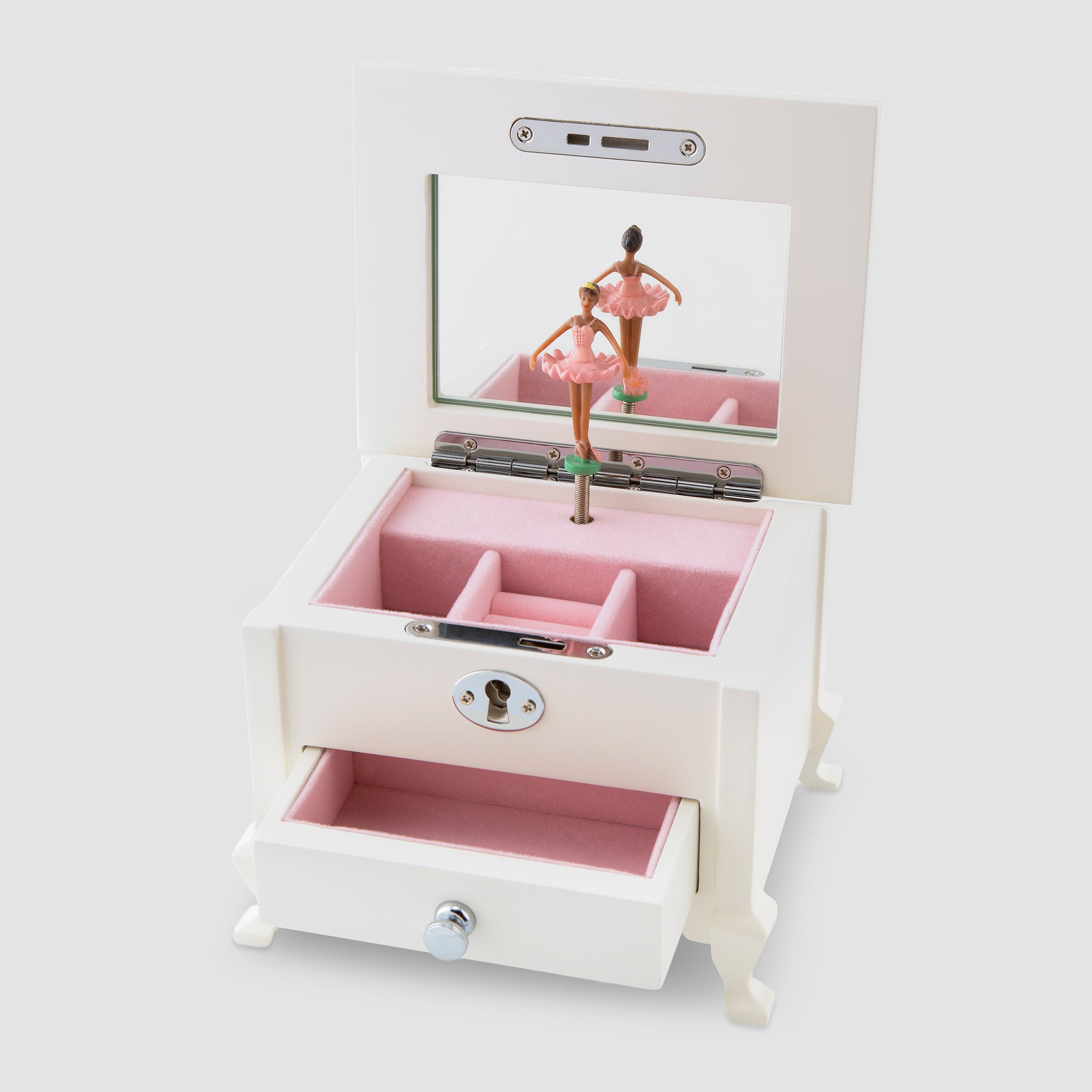 - White jewelry box with antique-styled feet that features a ballerina inside that twirls to the song "Swan Lake" when wound