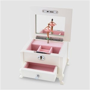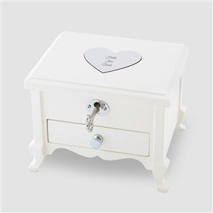 Gift your little ballerina our Footed White Jewelry Box. She will love keeping all of her favorite jewelry inside. It comes with a lock and key, and it also features a ballerina that twirls to the music once wound! Engrave the heart plate with her name, birth date, or a loving saying.