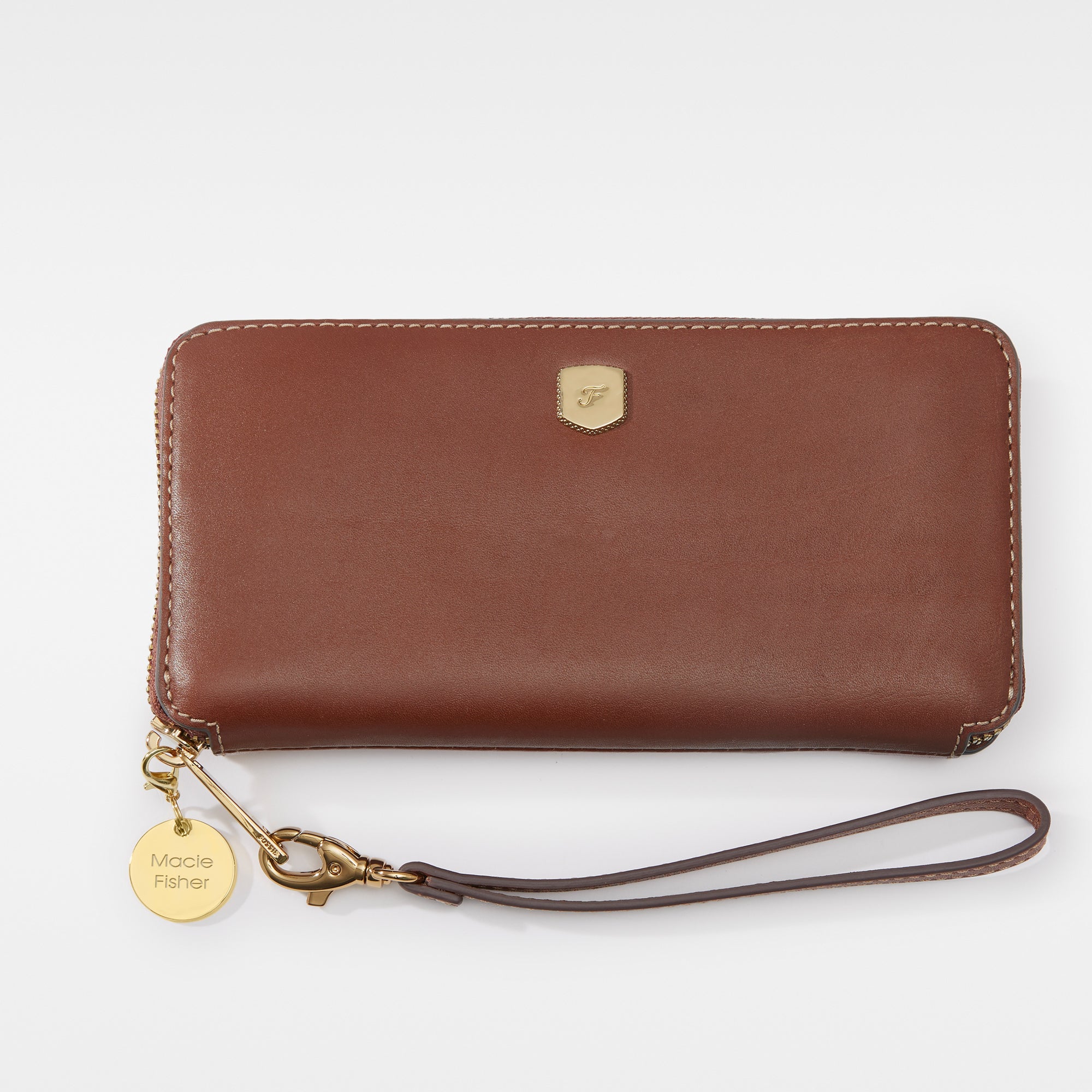• Fossil's brown leather wristlet with internal storage and removable wrist strap for easy transport