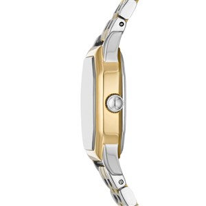 • Fossil's new Harlow watch design in two-tone silver & gold coloration with cream herringbone dial, three hand analog display