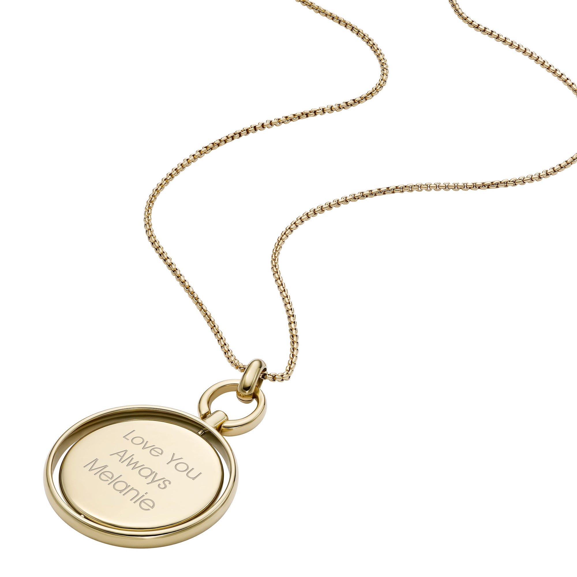 With a nod to Fossil's watchmaking heritage, this engravable charm necklace is inspired by classic pocket watches. It rotates to evoke a globe, an important icon throughout our history. The Legacy Charm tells our story—now let it tell yours. Designed to be personalized with your favorite mantra, special phrase or initials.