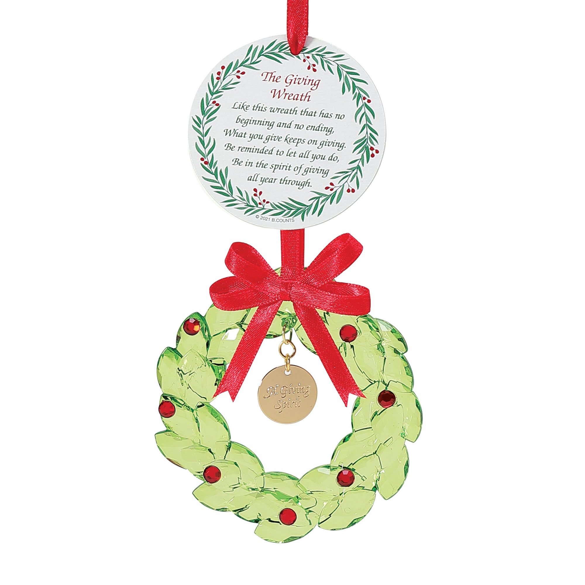 Be in the Spirit of Giving all year through with is high quality acrylic ornament. The gold tone charm is engraved with "A Giving Spirit" and the ornaments comes with a Giving Wreath Poem card.