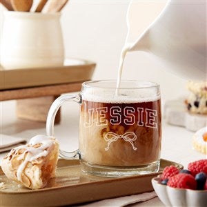 Celebrate her favorite title with this Engraved Glass Bow Mug by Jessie James Decker. Crafted from durable glass with a comfortable handle, it’s perfect for morning brews, afternoon pick-me-ups, or cozy evening tea. The transparent design beautifully showcases layered lattes, iced coffee, or her go-to roast, adding a modern touch to a heartfelt message.