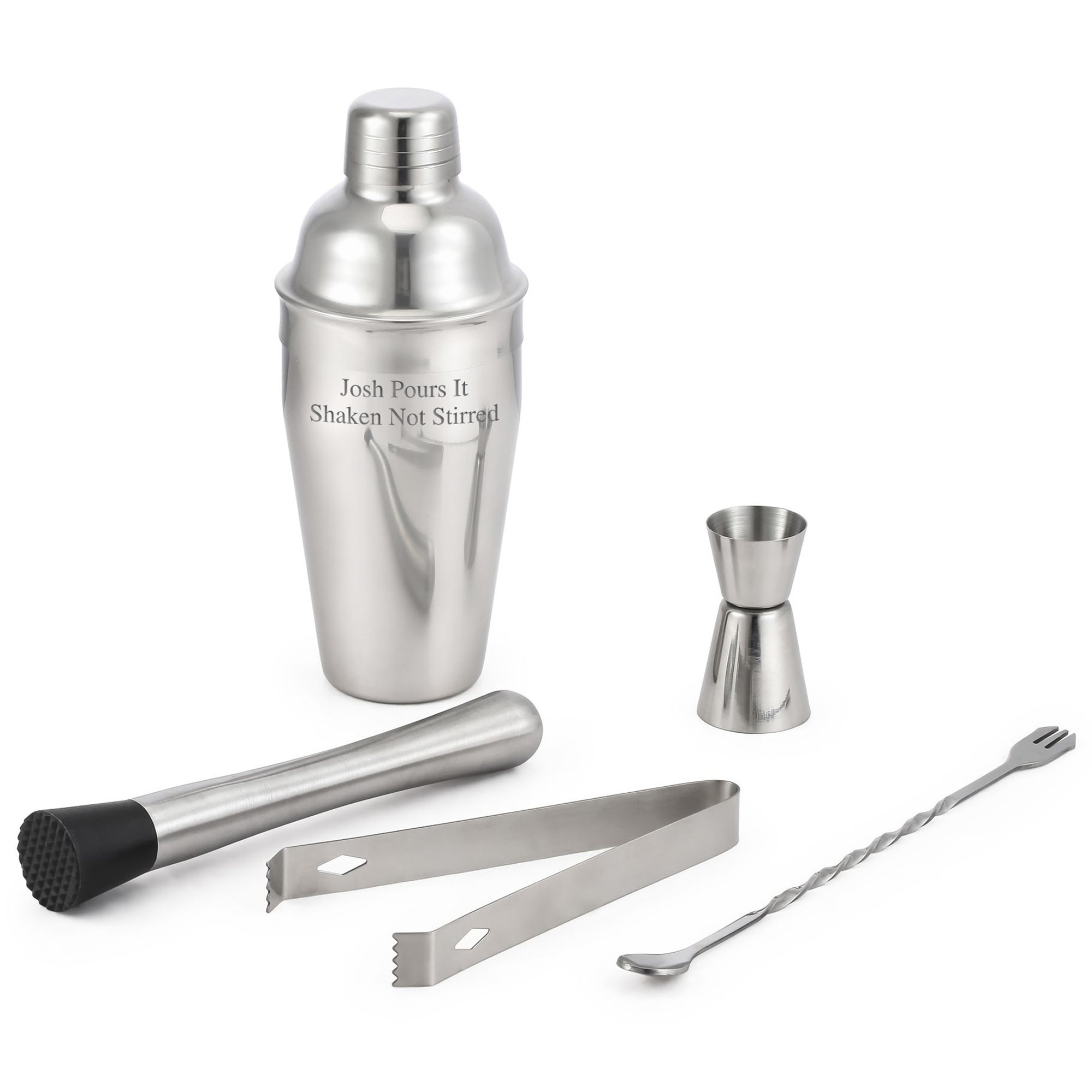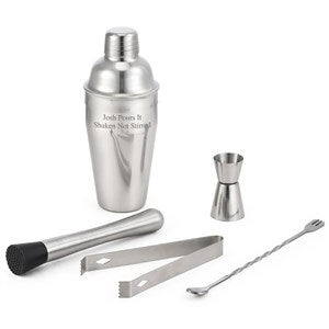 This Engraved Stainless Shaker & Barware 5pc Set is all they'll need to craft their favorite drink! Engrave the shaker with their name or a short message. Gift for housewarmings, retirements, birthdays, and more!