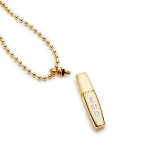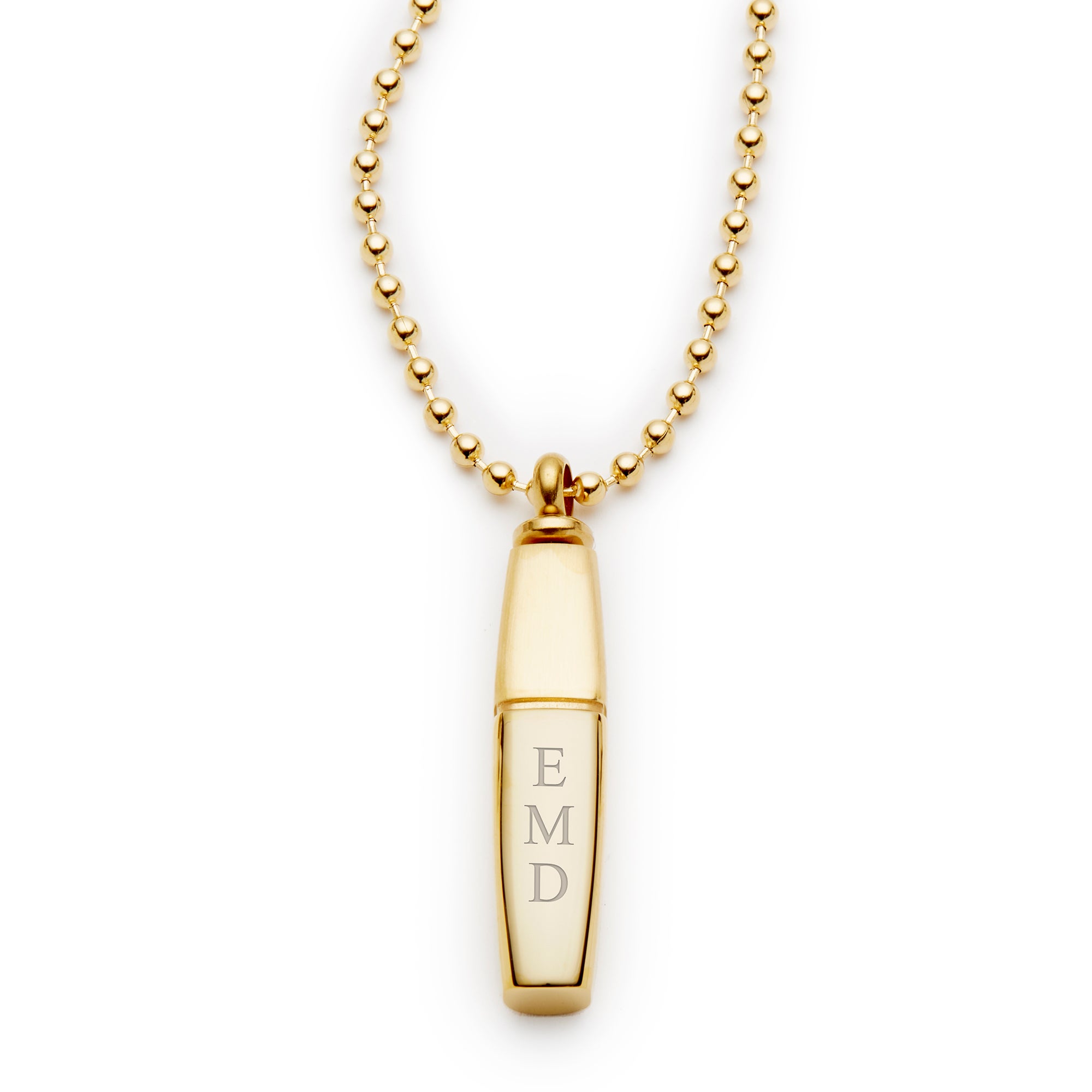 Keep their loved one close to the heart with our Gold Bullet Urn Necklace. The top of the necklace unscrews to hold a small amount of ashes. We'll engrave it with their name, a short message about them, or a favorite Bible passage or psalm.