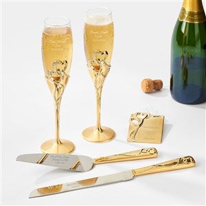 Our Engraved Gold Intertwined Heart Gift Set is complete with all the pieces they'll need to celebrate their big day and continue to use for years to come! Inside the custom box is a pair of flutes, a cake server set, and a keepsake ornament. Our customers love to engrave each piece with their names and wedding date as a beautiful reminder every time they celebrate at home. Each item can be engraved differently, it's up to you! The custom branded box is great for storage, keeping each item carefully in place when not in use. We also offer this set in a silver finish.