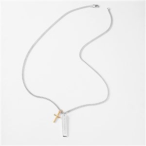 The Gold Cross and Sterling Silver Bar Necklace beautifully combines a cross and simple bar pendant to create an accessory that can be dressed up or easily worn every day. Gift it to your special someone for their birthday, a special holiday, or for any religious occasion. Engrave the bar vertically or horizontally with their name, initials, or a significant date. We also offer this necklace in an all-silver version. Perfect for confirmations, baptisms or Christmas gifts! This style is unisex, the chain length is longer at 24" to be comfortably worn by anyone 12+.