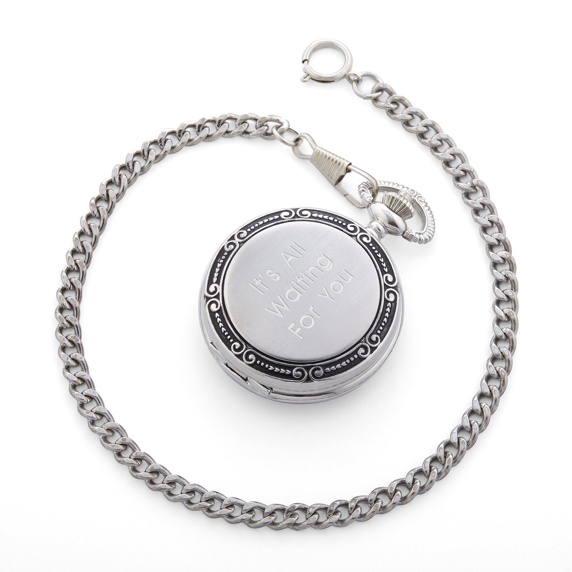 - Silver pocket watch with scroll border detail, comes in black lacquer box with additional engraving area.
