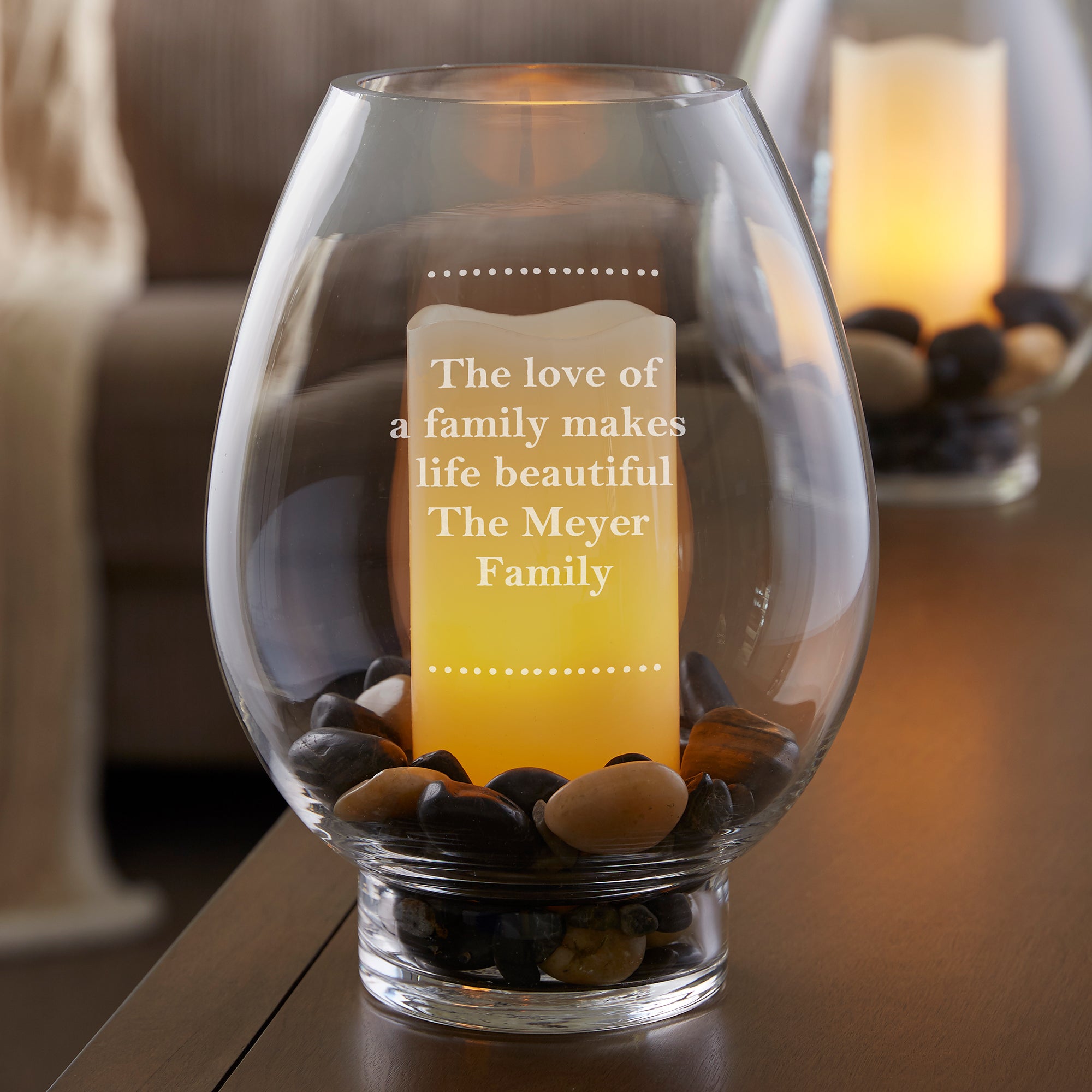 Capture the light and enjoy as a soft glow emanates from our Write Your Own Engraved Hurricane Candle Holder. An unforgettable, personalized gift for weddings, housewarmings and more!