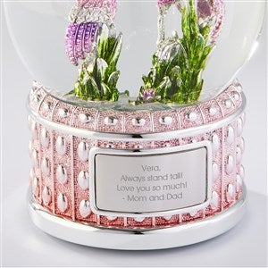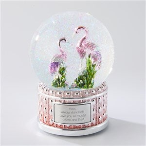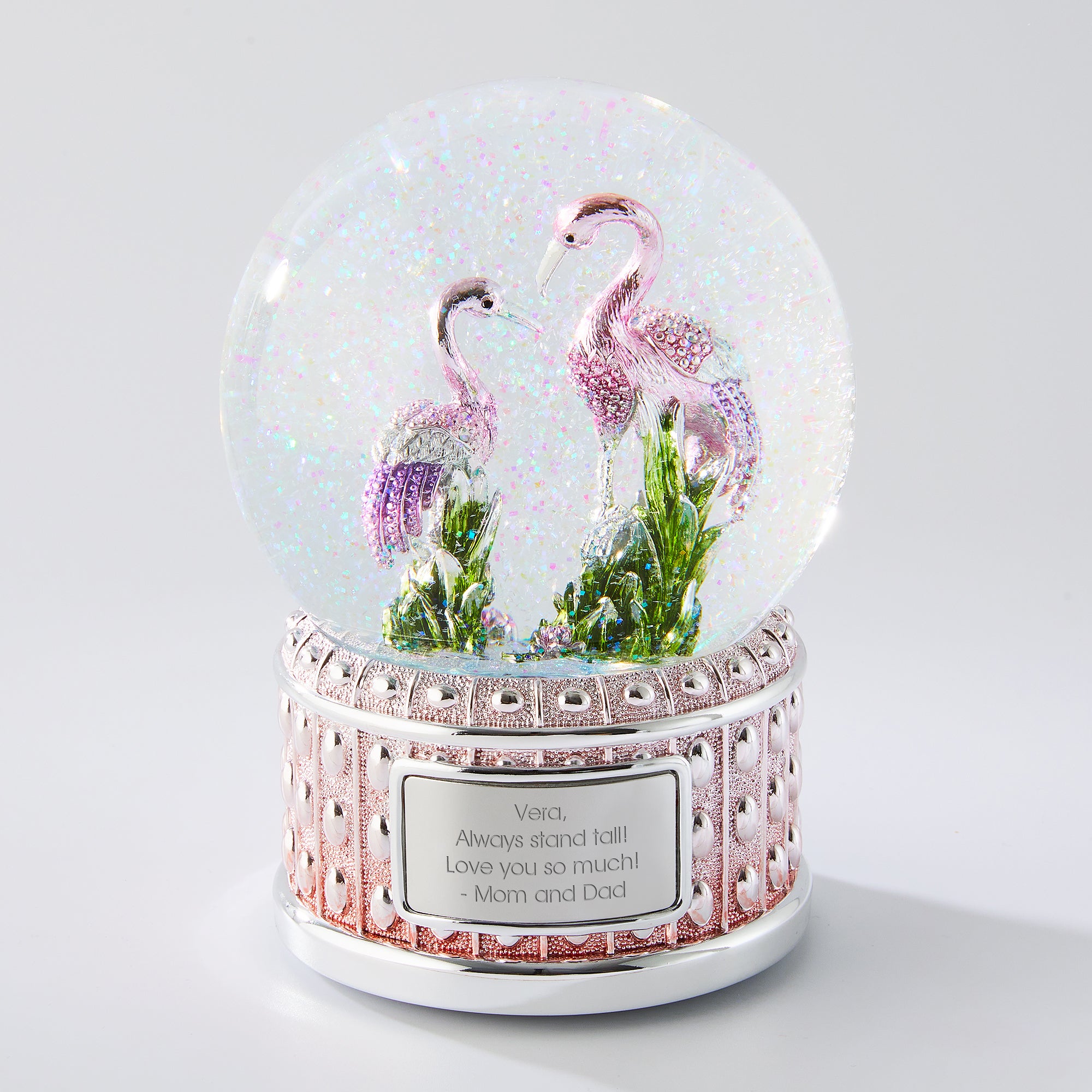 Our Jeweled Flamingo Snow Globe features two flamingos with jeweled detail standing among lily pads. Gift it to any family as a reminder of your love and appreciation for them. They'll love the sparkles and the music that plays when they wind it up! We'll engrave their names or a note from you on the base to make it even more special.