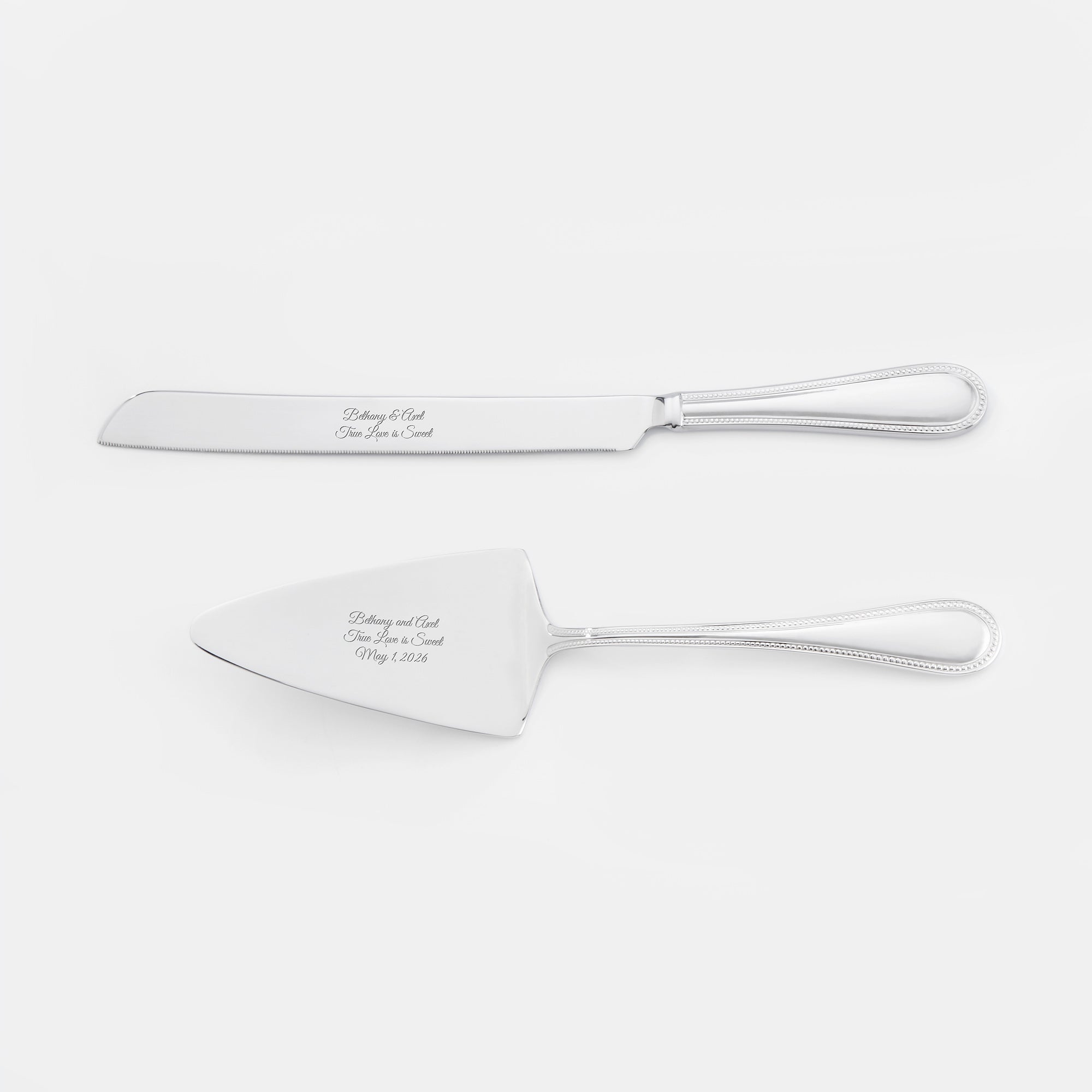 • Personalize with up to 3 lines of text on cake server and 2 lines of text on cake knife in your choice of font