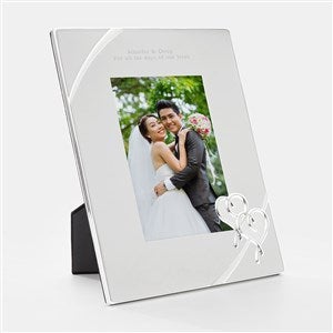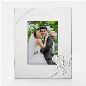 This 5x7" picture frame from trusted brand Lenox is even more beautiful with your engraved message. From their "True Love" collection, the design features two hearts in the lower right corner and a wrapped ribbon detail sculpted in silver metal. We'll add your personal message above the photo; we suggest their names, wedding or anniversary date, or a heart-felt note. They'll love to see their favorite wedding or family photos on display with such love and care.