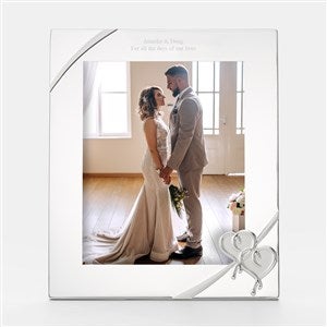 The Engraved Lenox "True Love" 8x10 Picture Frame from trusted brand Lenox is even more beautiful with your engraved message. From their "True Love" collection, the design features two hearts in the lower right corner and a wrapped ribbon detail sculpted in silver metal. We'll add your personal message below the photo; we suggest their names, wedding or anniversary date, or a heart-felt note. They'll love to see their favorite wedding or family photos on display with such love and care.