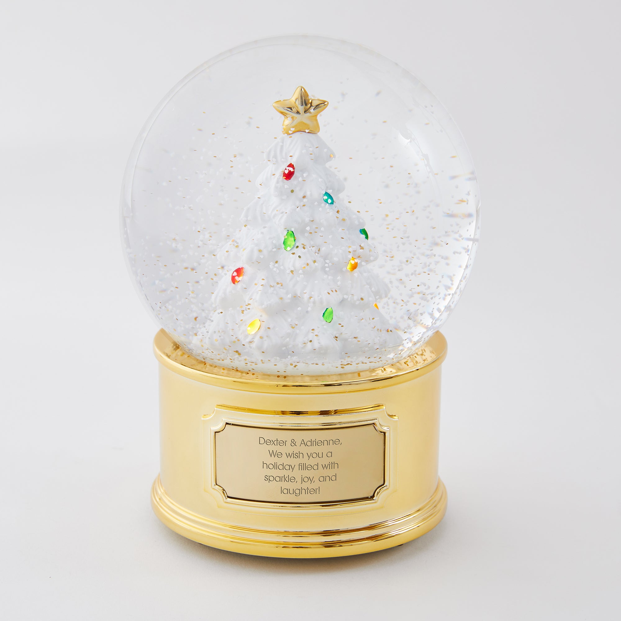 • Holiday snow globe with a vintage-inspired white Christmas tree, colored lights, and a shiny gold star