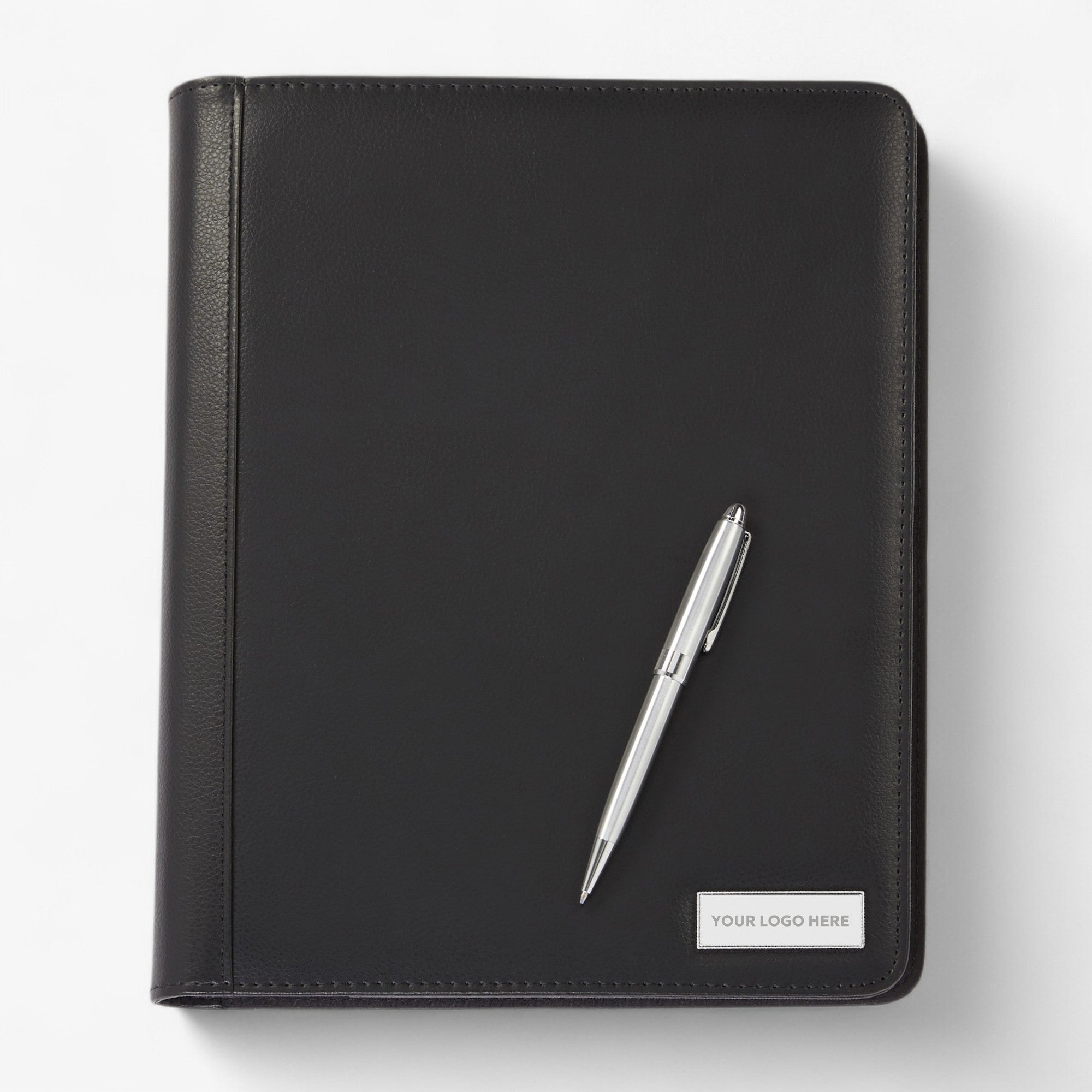 Engraved Logo Black Vegan Leather Padfolio and Pen Set