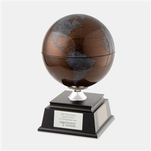 The Engraved Logo Copper Solar Globe is certain to take center stage at home or at the office. This spinning globe makes a unique award or keepsake to celebrate special occasions. Engrave the plate at the base with a name, logo, and/or text.