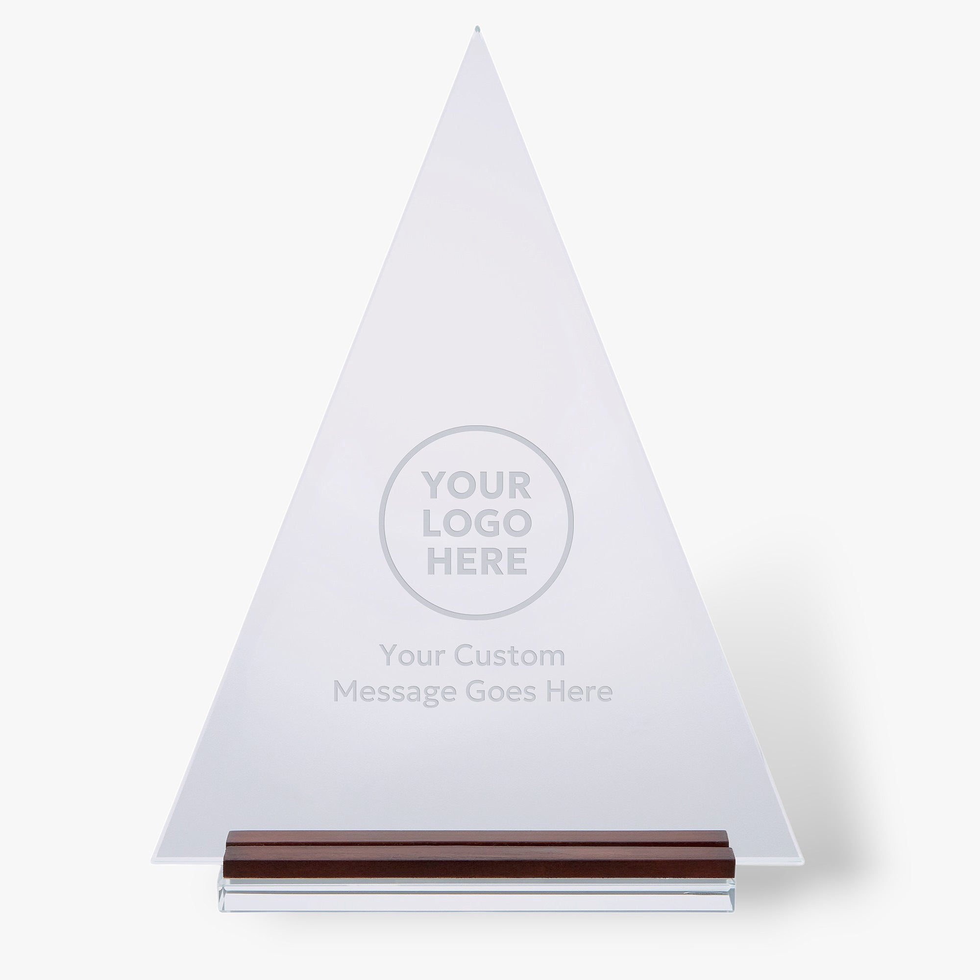 The Engraved Logo Large Glass Triangle with Wood Base Award can be engraved with any name, logo, and/or text to create a unique award congratulating a job well done. The wood detail on the base modernizes the style of this award and makes it a wonderful addition to any office.