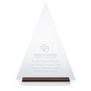 - Large glass triangle award with wood base