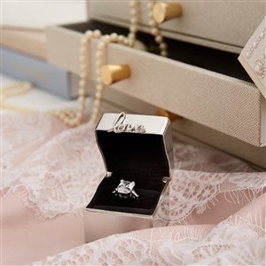 The Engraved Love Silver Ring Box gives them a charming way to stow their wedding ring at the end of the day! They will love the glistening material and the design that features the word "love" across the front of the box. It can be made even more meaningful through the engraving of your personalized message. Add their name, the couple's initials, their wedding date, or a sweet note.