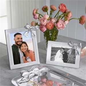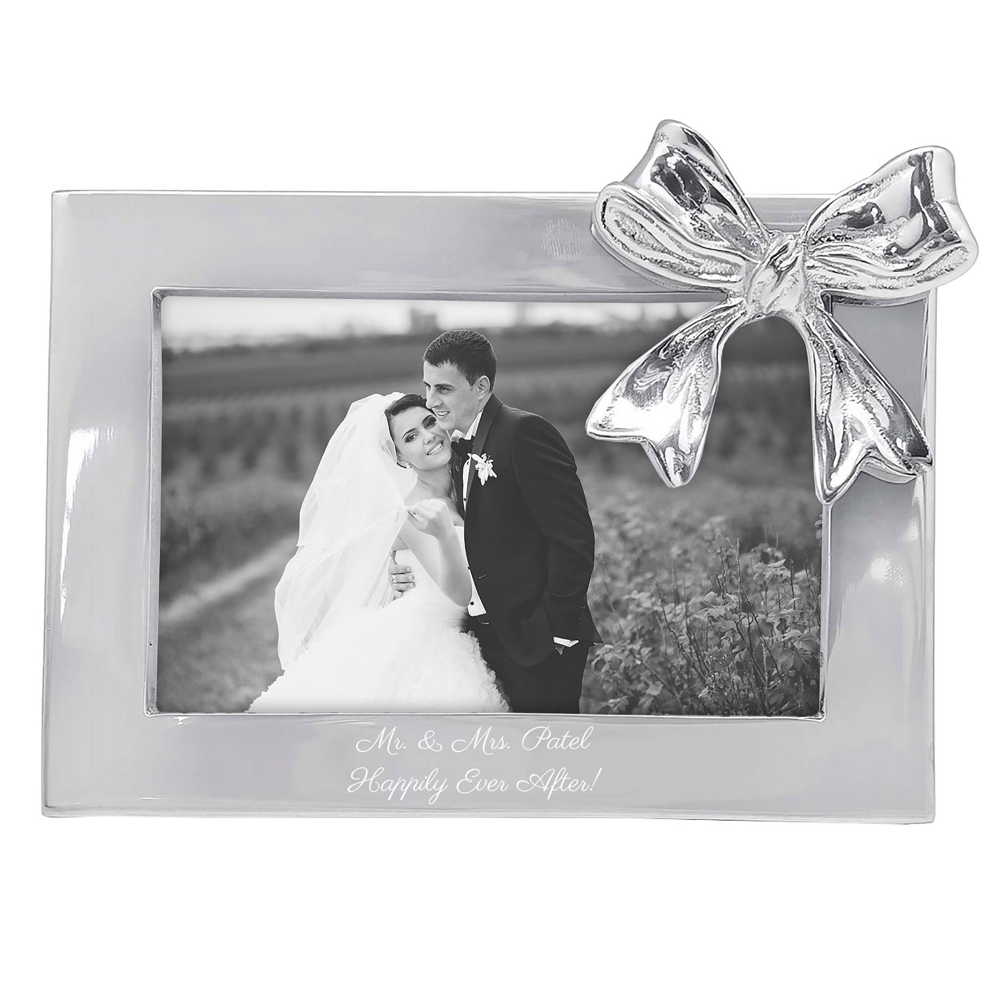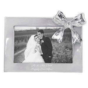 From beloved brand Mariposa, this bow frame will beautifully display one 4x6 photograph. This is a lovely gift for a variety of occasions. Engrave the bottom of the frame with any name, date, or short message for extra sentiment.