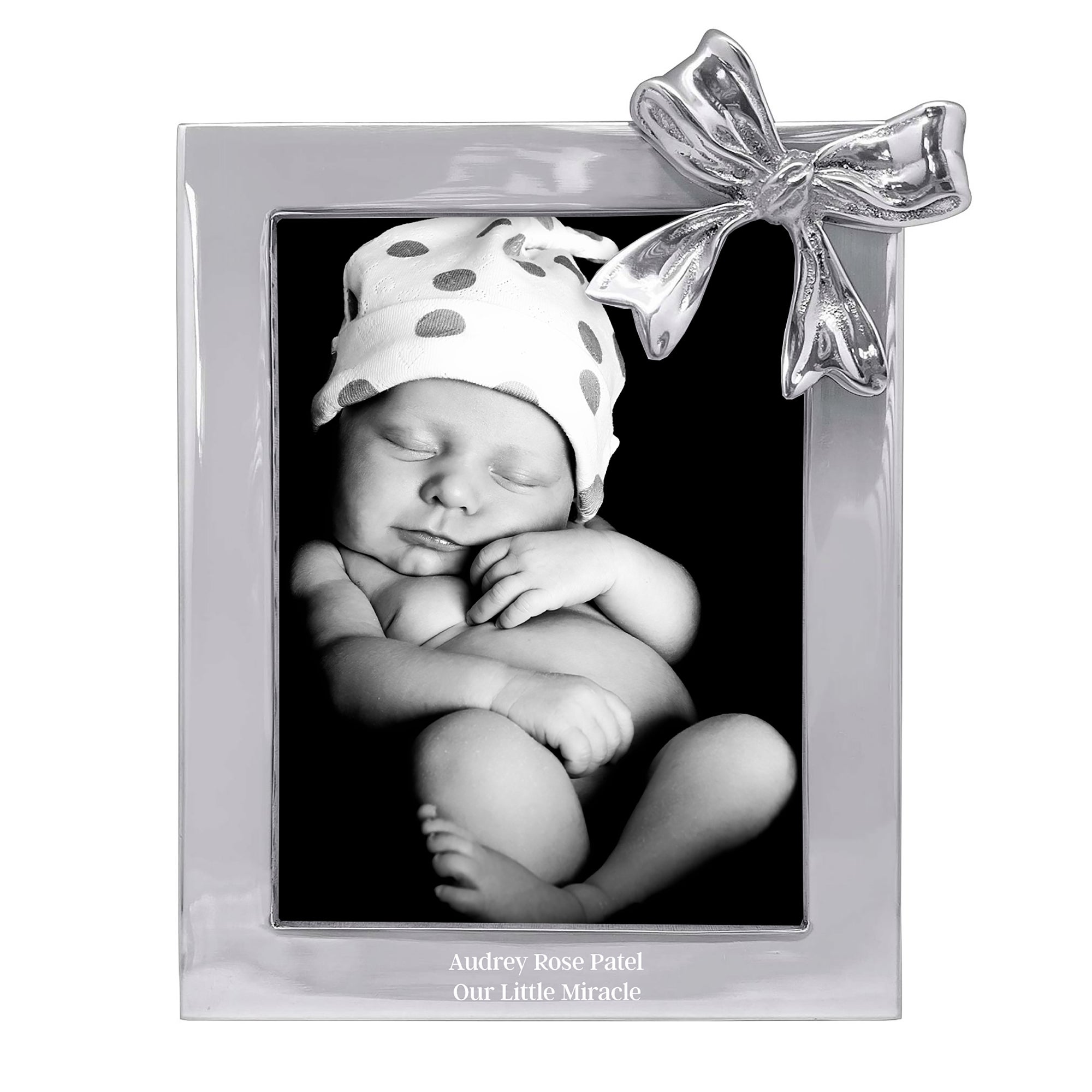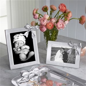 From beloved brand Mariposa, this bow frame will beautifully display one 5x7 photograph. This is a lovely gift for a variety of occasions. Engrave the bottom of the frame with any name, date, or short message for extra sentiment.