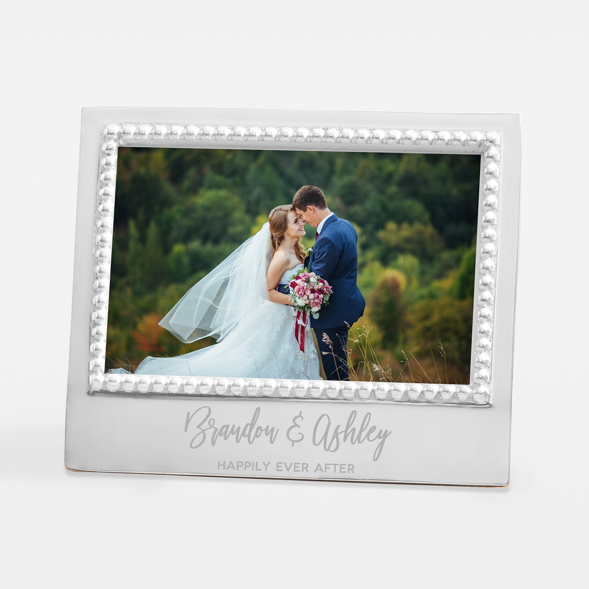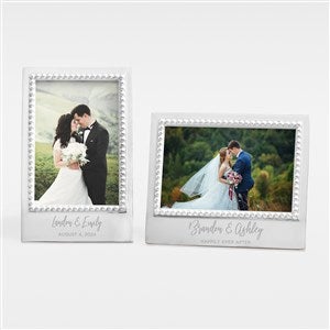 The classic design of the Engraved Mariposa® Wedding Message Statement Frame is an elegant compliment to any couple's photo. This stunning frame edged with a handcrafted string of pearls border, makes an exquisite gift.