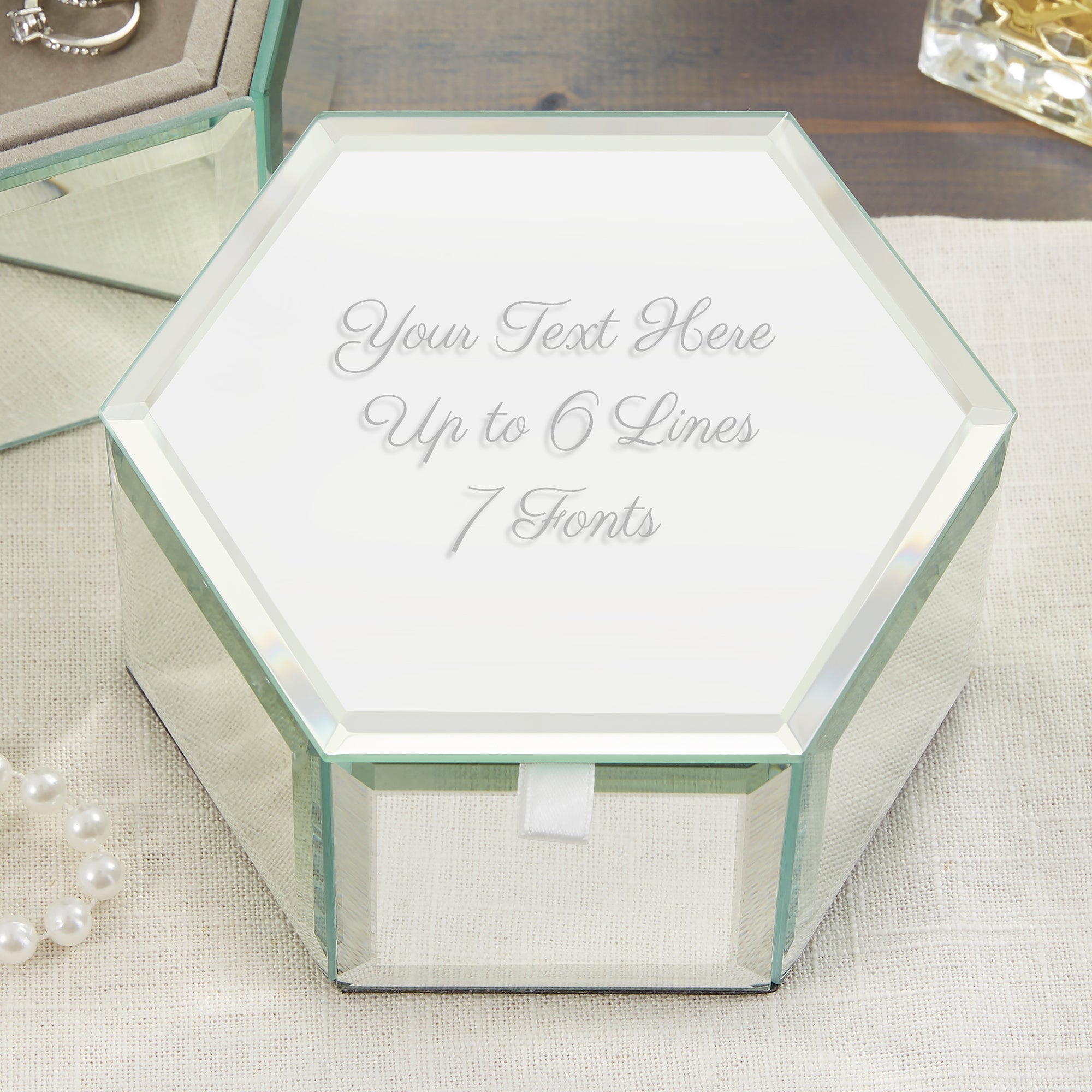 Create a stunning gift for a special woman in your life with our Engraved Message Hexagon Jewelry Box. This elegant jewelry box features a mirrored finish all around and removable interior tray, creating a unique gift.