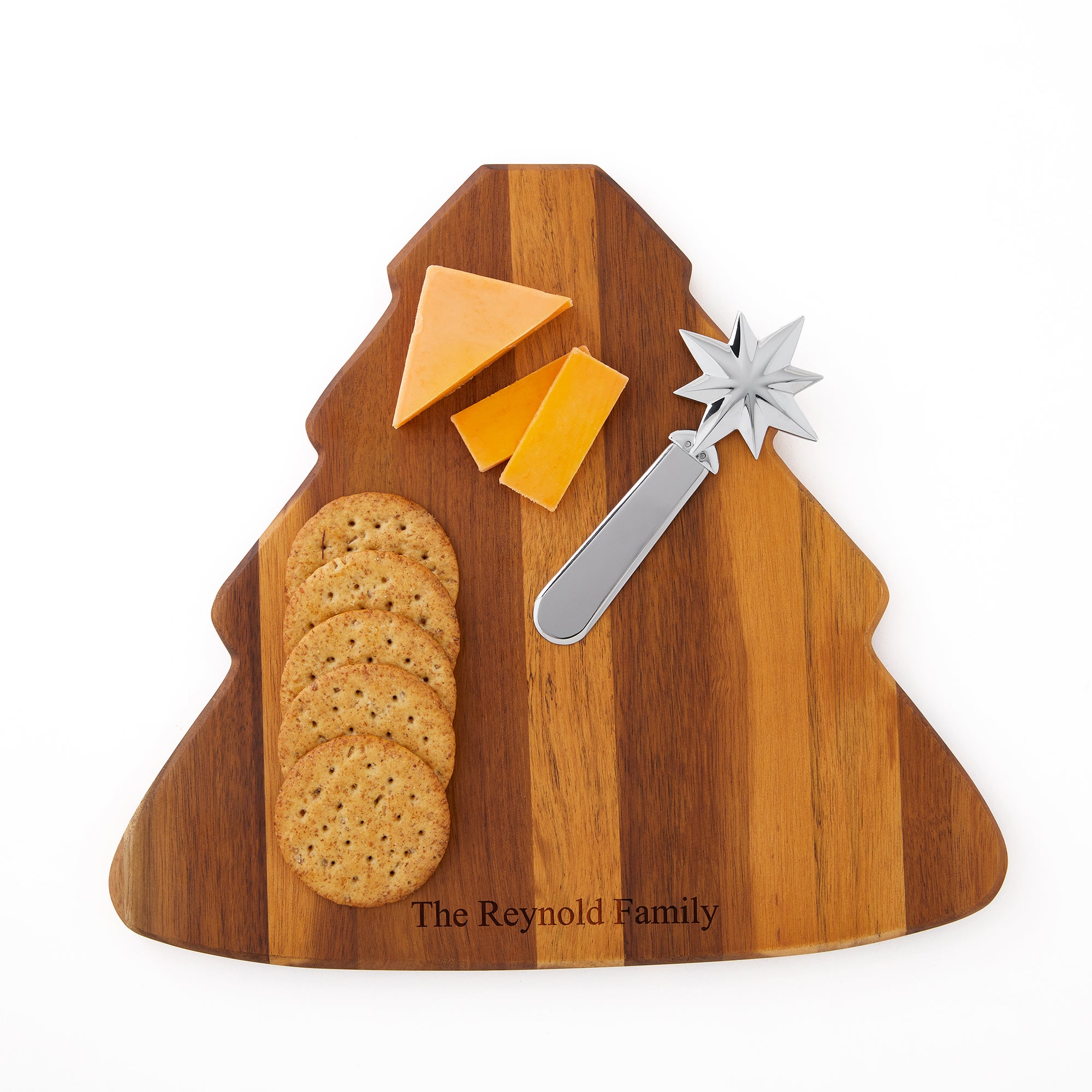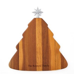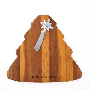 Serve your cheese and crackers festively at the next winter gathering! The Nambé Christmas Tree Cheese Board with Star Spreader comes with a star-shaped spreader that inserts at the top of the tree. Engrave the bottom of the board with a family name or holiday message.