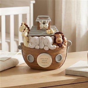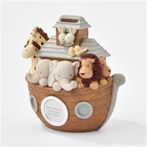 Our Noah's Ark Resin Coin Bank has delighted kids ever since we introduced it to the collection. This sweet friend will hold their coins and a message to them. Many of our customers engrave a new baby's name, birth date, height, and weight on it for them to have and remember as they grow into bigger kids.
