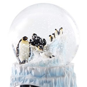 - Playful penguins are featured in this snow globe with a base sculpted like an iceberg