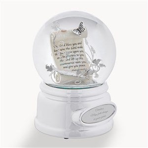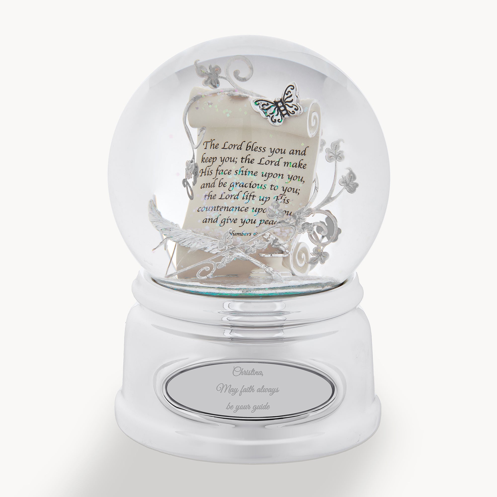 • The Prayer Scroll Snow Globe features an off-white scroll with well-known Biblical Numbers 6:24-26; "The Lord bless you and keep you..." in black text