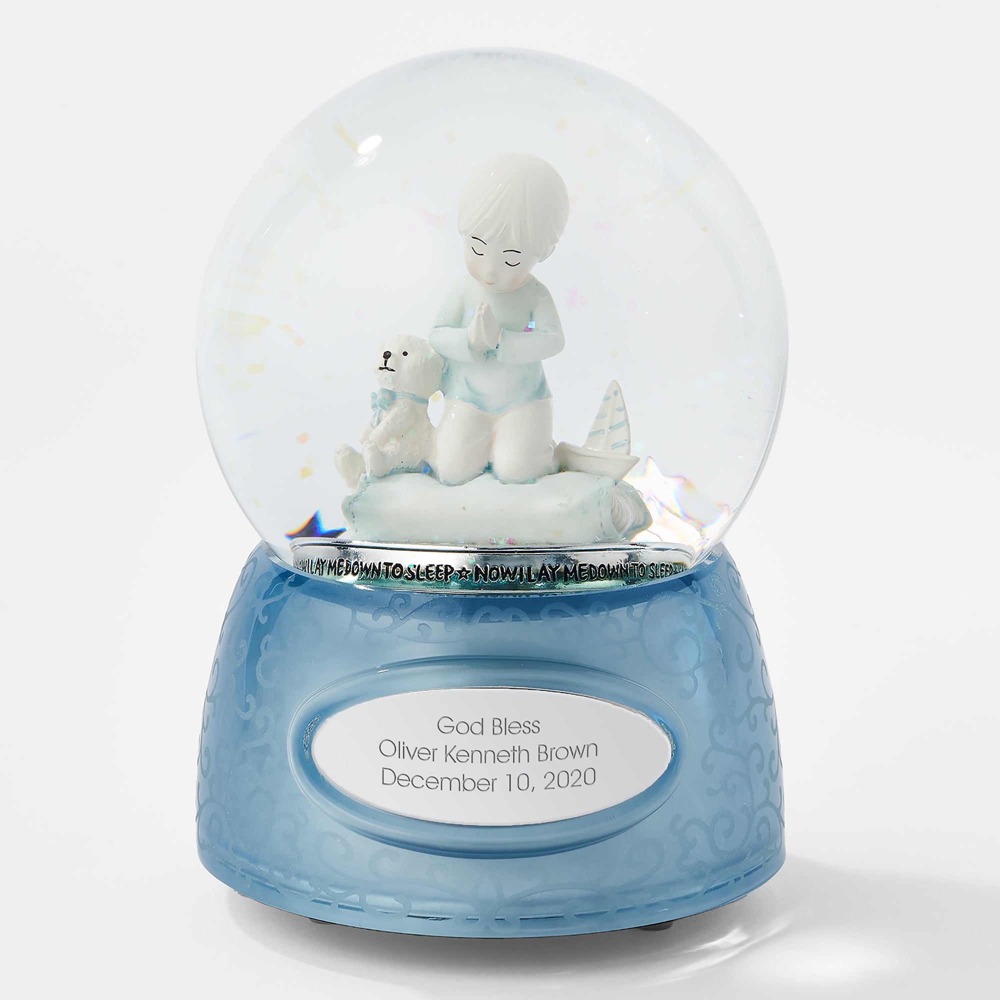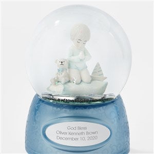 Our Engraved Praying Boy Snow Globe is a sweet Baptism gift when personalized with their name and note to them. They'll feel your love over the years as they grow. When wound up, the little boy kneeling in prayer rotates inside of the globe as it plays "The Lord is My Shepherd."